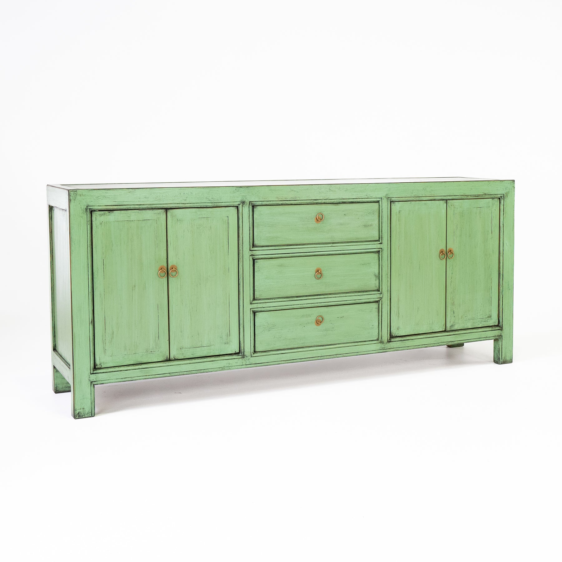 Bring a refreshing pop of colour to your space with our stunning 3 Drawer 4 Door Buffet in a captivating shade of green. The carefully curated distressed effect adds a touch of vintage charm and character, making each piece truly one-of-a-kind. Offering ample storage space for all your dining and entertaining essentials, this timeless buffet effortlessly complements a variety of interior styles.