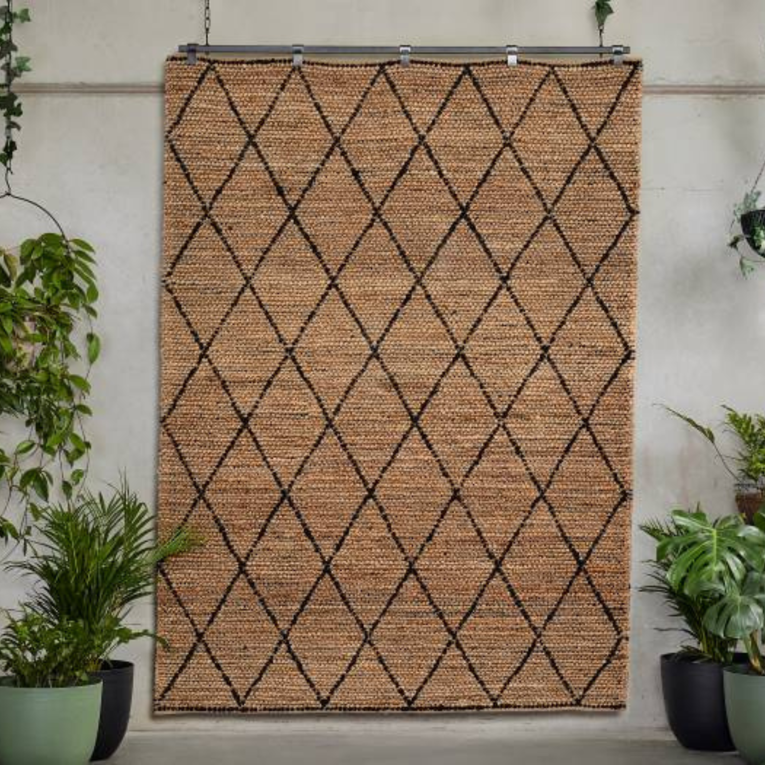 Bring natural elegance to your space with the Aranda Black Handwoven Jute Rug. Crafted from 100% sustainable jute, this rug features a timeless diamond lattice pattern in black, adding a subtle contrast to the warm, earthy tones of the woven fibers. Its textured surface and durable construction make it a stylish and practical choice for living rooms, bedrooms, or entryways.