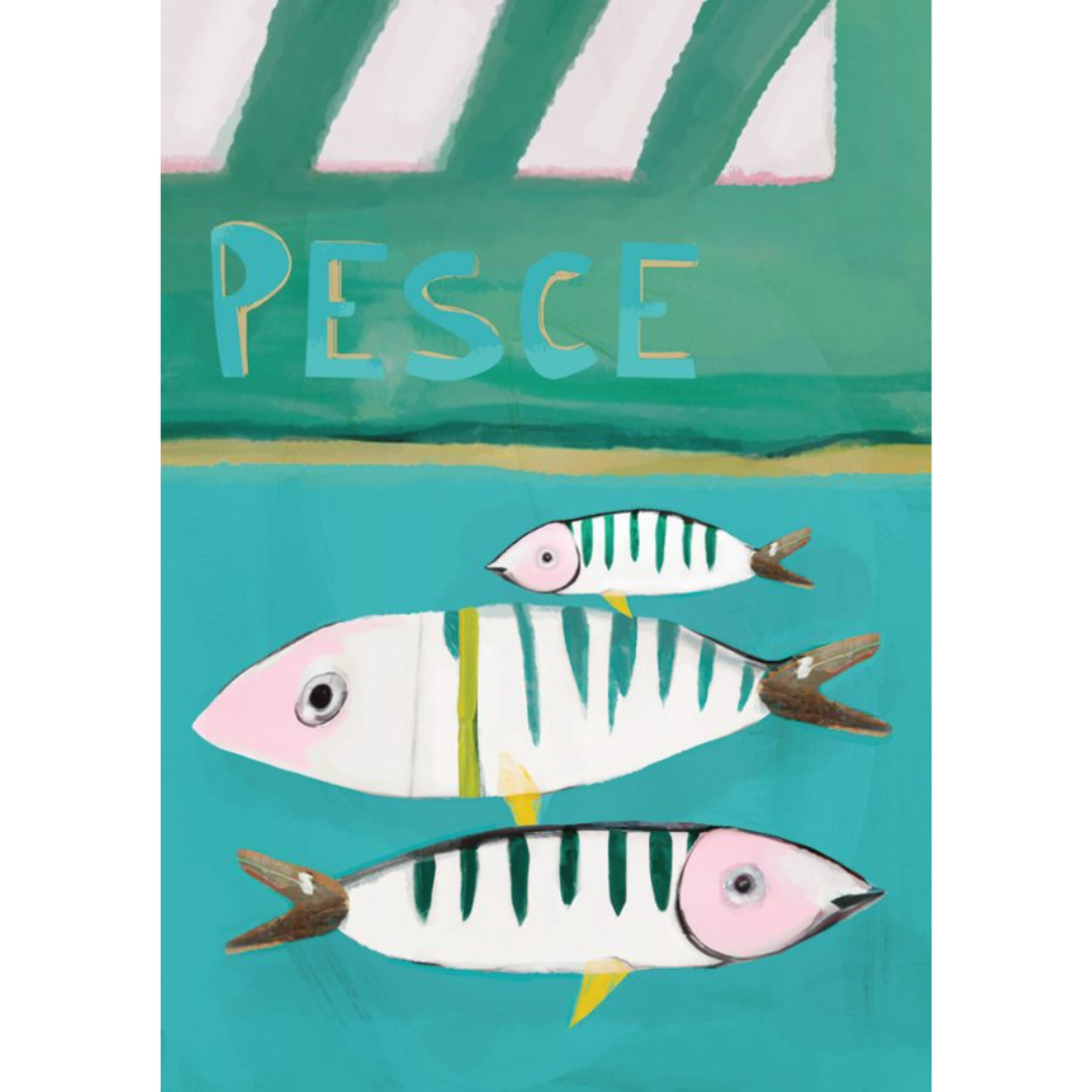 Embrace the vibrant charm of coastal life with this playful and colorful artwork. Featuring three stylized fish adorned with bold, graphic stripes, this piece captures the lively energy of the sea. The turquoise background and whimsical brushstrokes evoke a sunny Mediterranean market, complete with the word “Pesce” (Italian for fish) adding a touch of cultural flair.