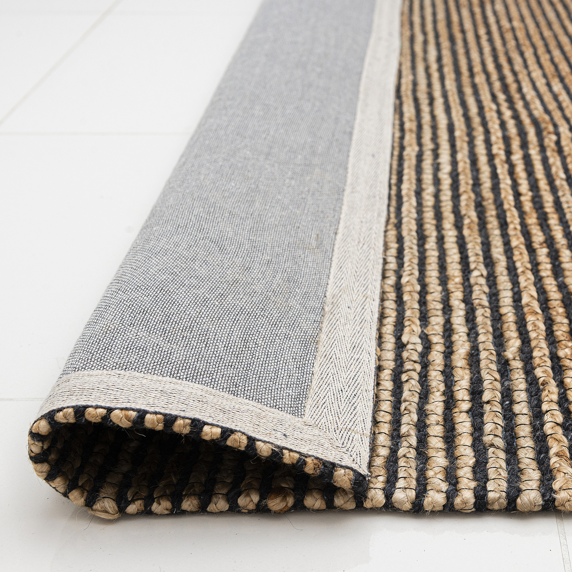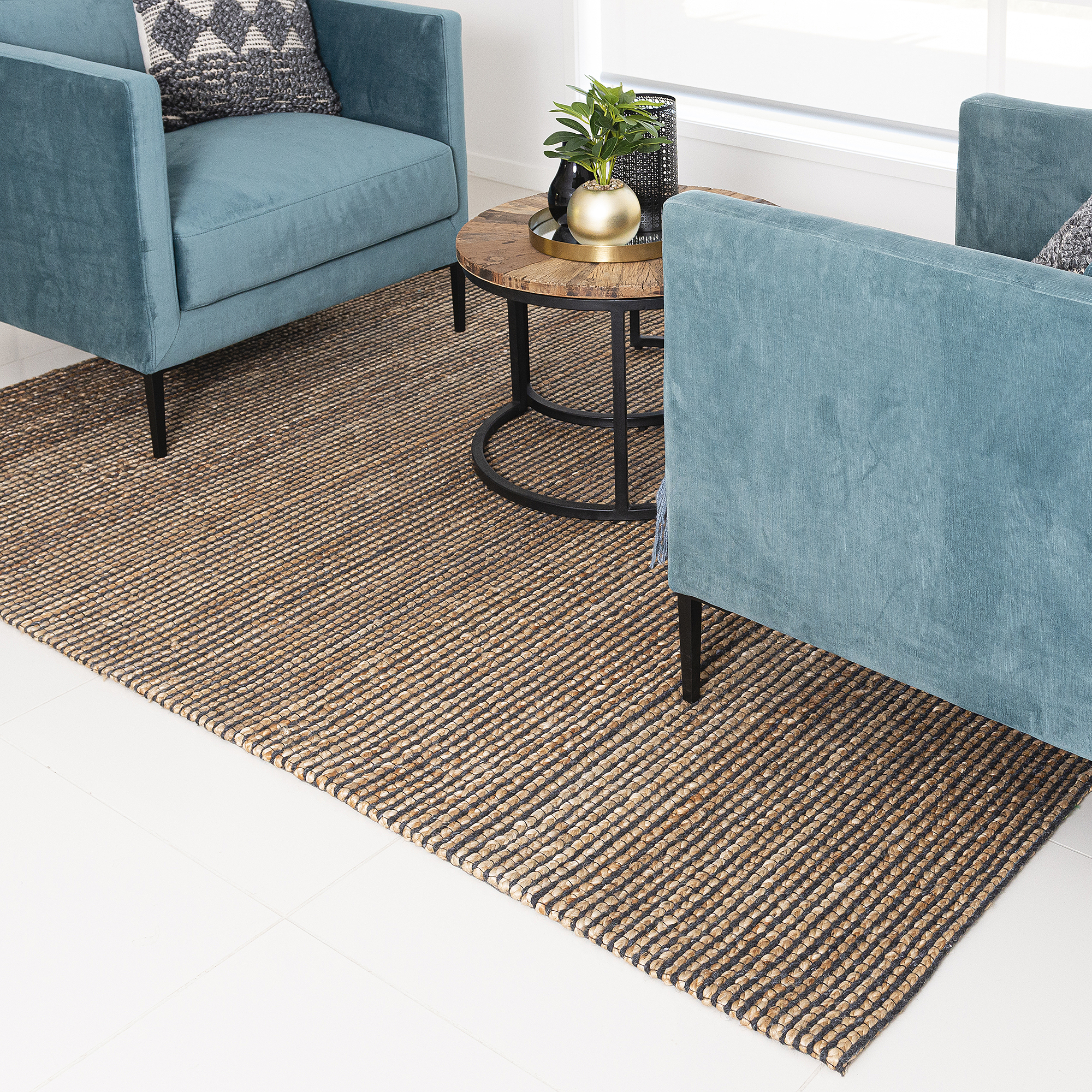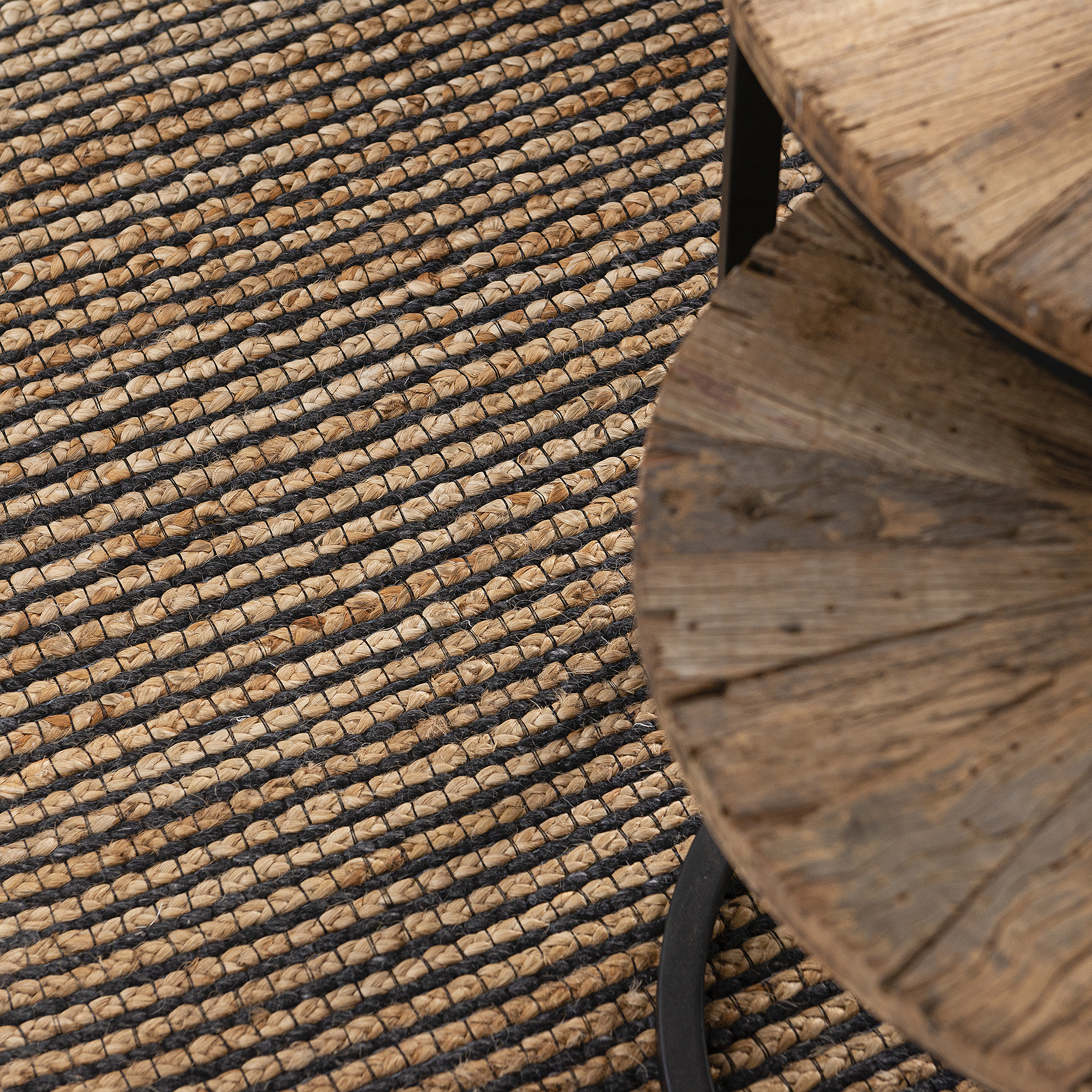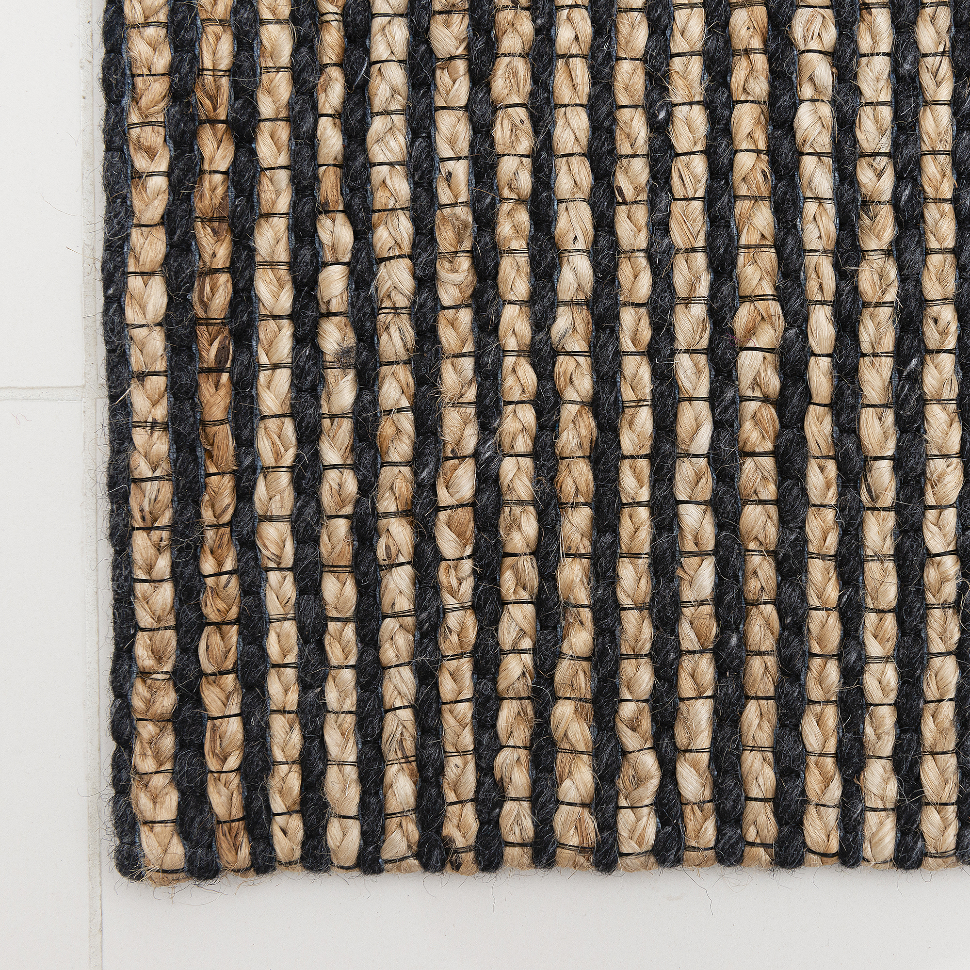Alternating jute braided into long strands with wool braided strands our skillful artisans create this flatwoven natural fiber rug. The strands stitched over with durable threads and glued onto the cotton backing to give the rug it’s shape and structure. The mix of natural golden hue of the jute are supplemented by the neutral pallet of the dyed wool to bring out the contemporary feel to it’s timeless design.