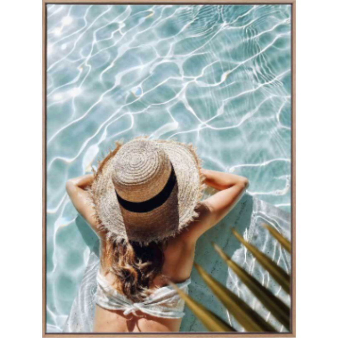 Forever Vacation Canvas Art Print – This vibrant photographic art print transports you to a sun-drenched coastal escape. A woman in a wide-brimmed hat lounges by a sparkling pool, her relaxed posture inviting you to unwind. The vivid turquoise waters and warm sunlight create a serene, dreamy atmosphere.