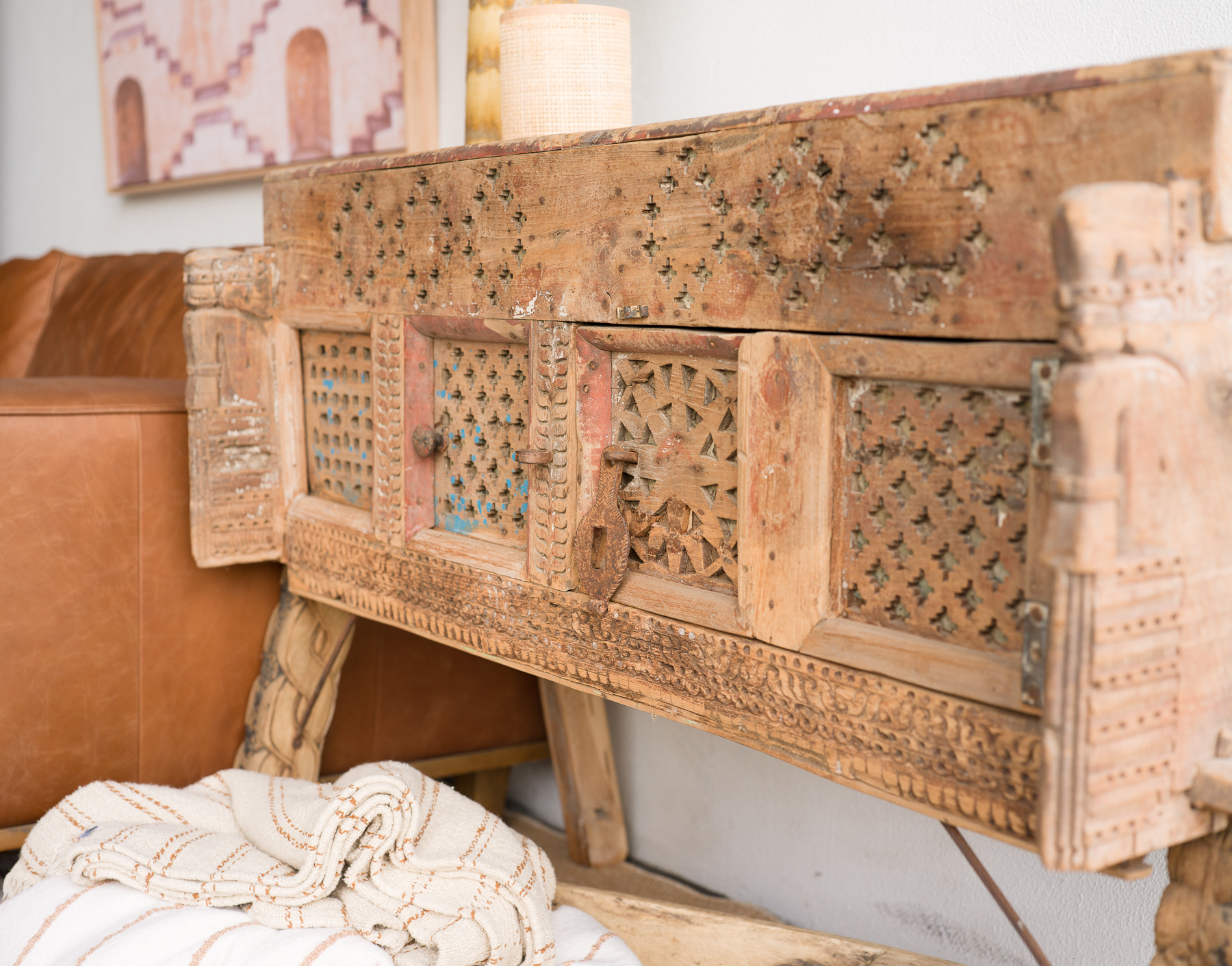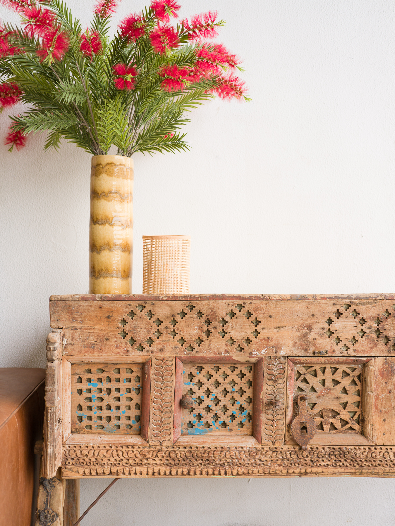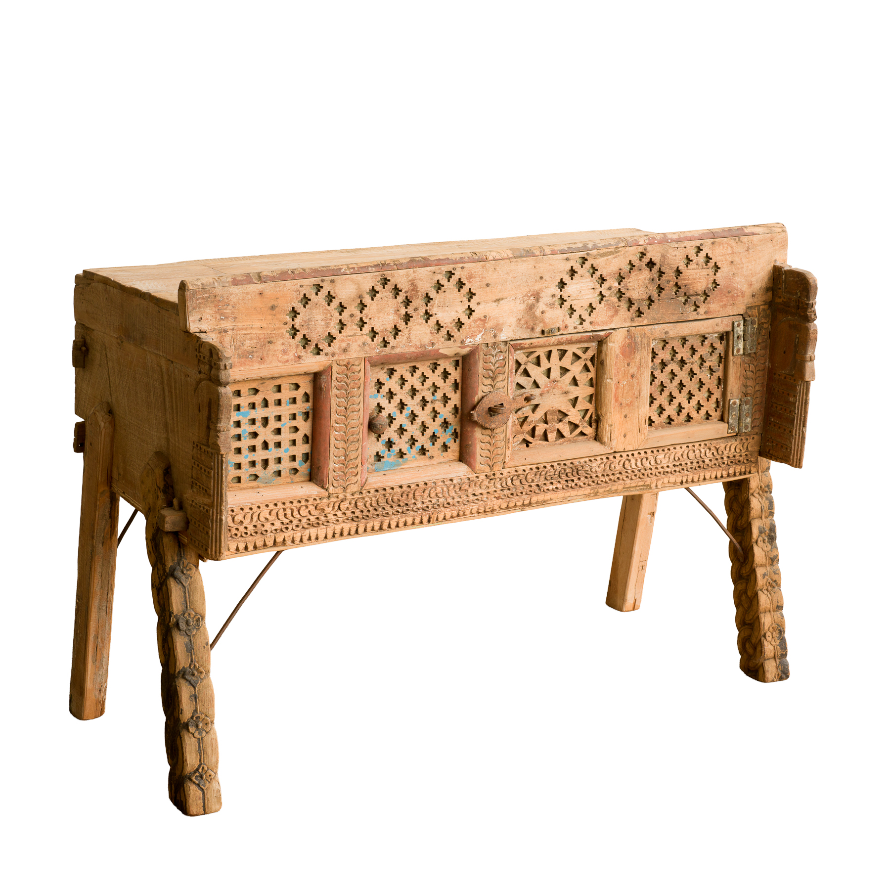 A rare find, this hand-carved damchiya brings the spirit of traditional India into modern interiors. Once used as a dowry chest in rural Indian homes, these beautiful pieces stored a bride’s jewellery, textiles, and treasured possessions.
