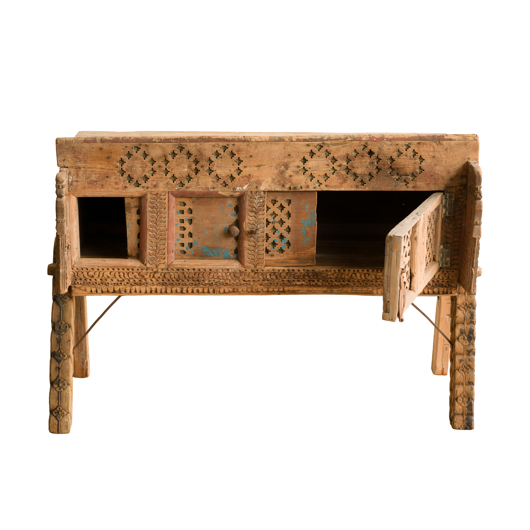 Crafted from solid teak and adorned with intricate latticework and carvings, each damchiya was designed not only for function but also to showcase the family’s craftsmanship and prosperity. Subtle traces of old paint and patina reveal its journey through time, adding to its soulful charm.