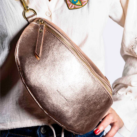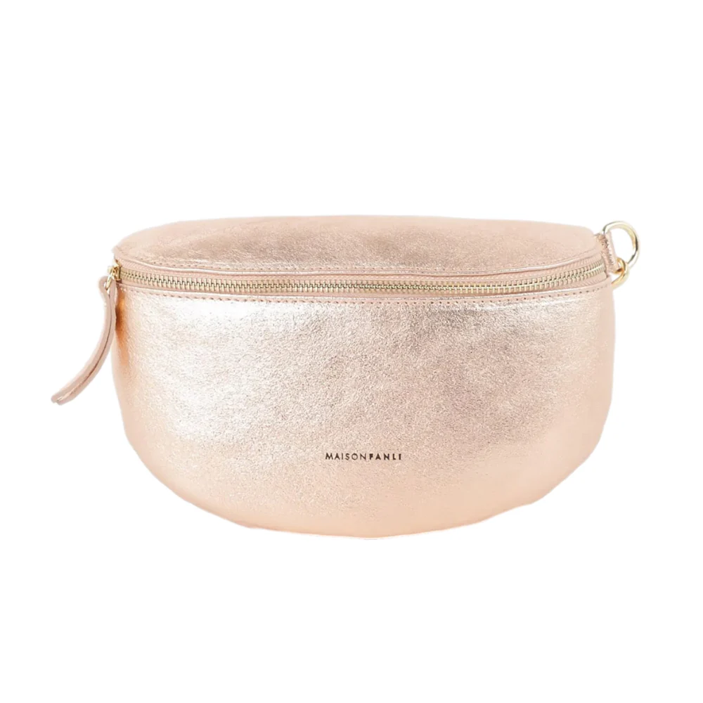This stylish bum bag is crafted from 100% cowhide leather with a metallic rose finish, making it a fashionable accessory. It can be worn around the waist or across the shoulder, offering versatility in styling.