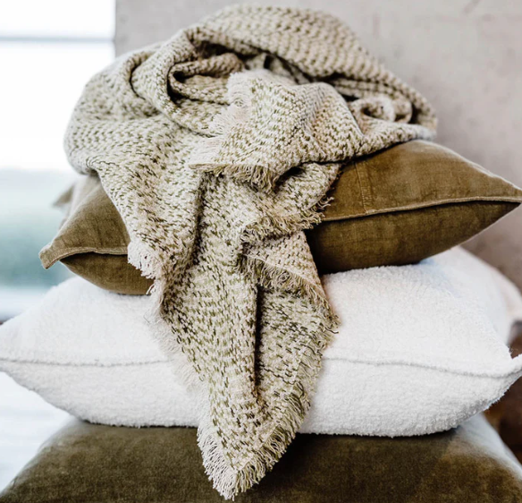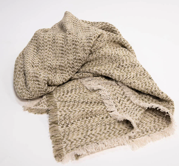 The Midori Throw pays homage to its Japanese roots with a blend of green tones and off-white yarns, expertly woven into a jacquard herringbone pattern. Featuring four sides of intricate fringing—two sides adorned with green fringe and the other two with a soft off-white fringe, adding dimension and contrast to its design.