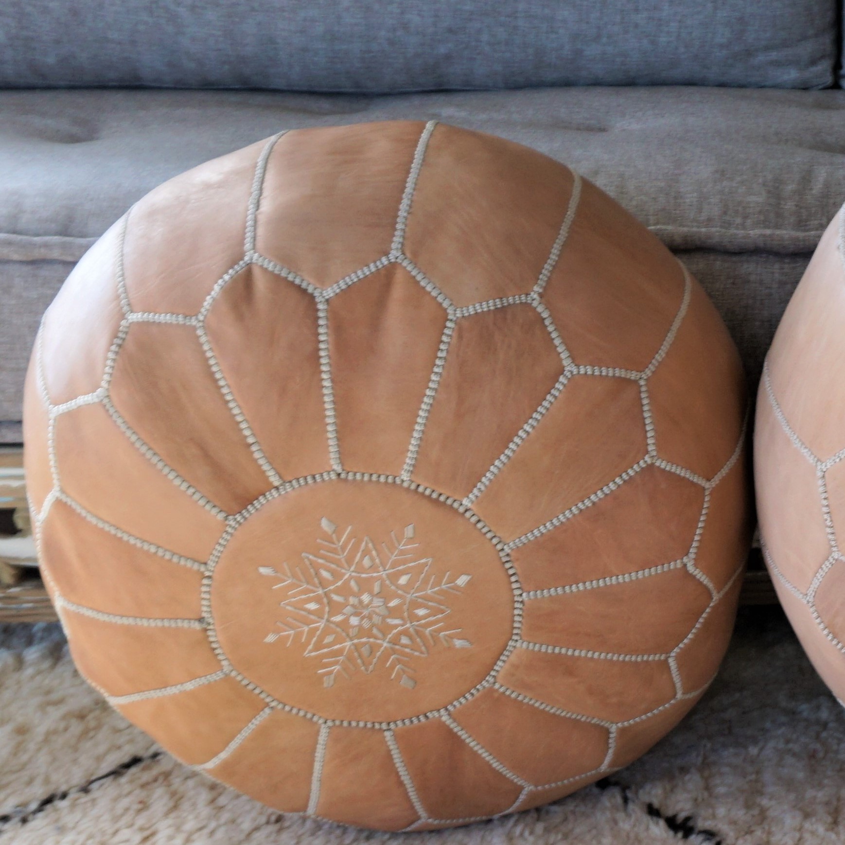 These Moroccan Ottomans are handmade from beautifully neutral-toned leather and feature elegant cream embroidered stitching. They are timeless, versatile, and the perfect Moroccan-inspired accent piece for any stylish home.