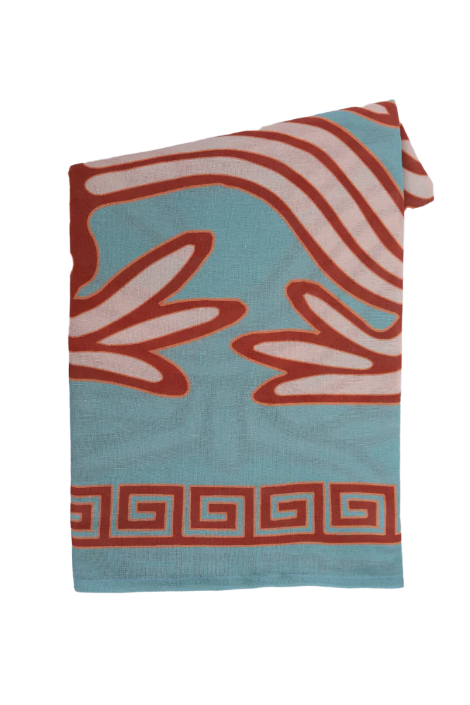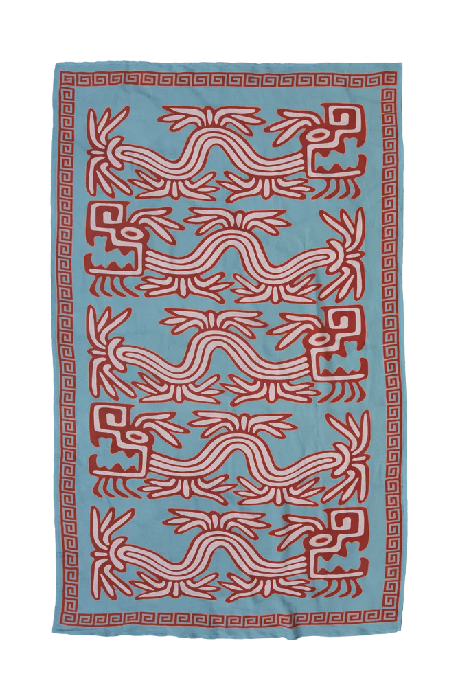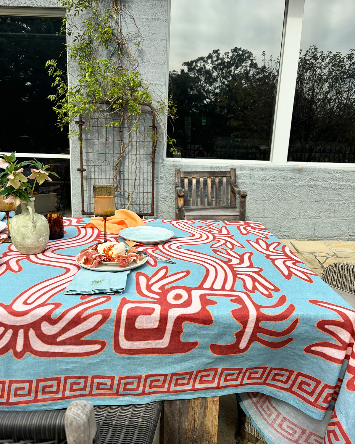 The Rainmaker Tablecloth, adorned in an oversized illustration of the Quetzalcoatl, patron of rain. This feathered serpent print extends the entire length of the table bordered by a geometric key design. Created in a powder blue with rich rust and peach highlights. The core ingredient of any great table setting. Designed to be paired back with matching print or plain napkin sets and crockery staples from the home. Made to mix and match.