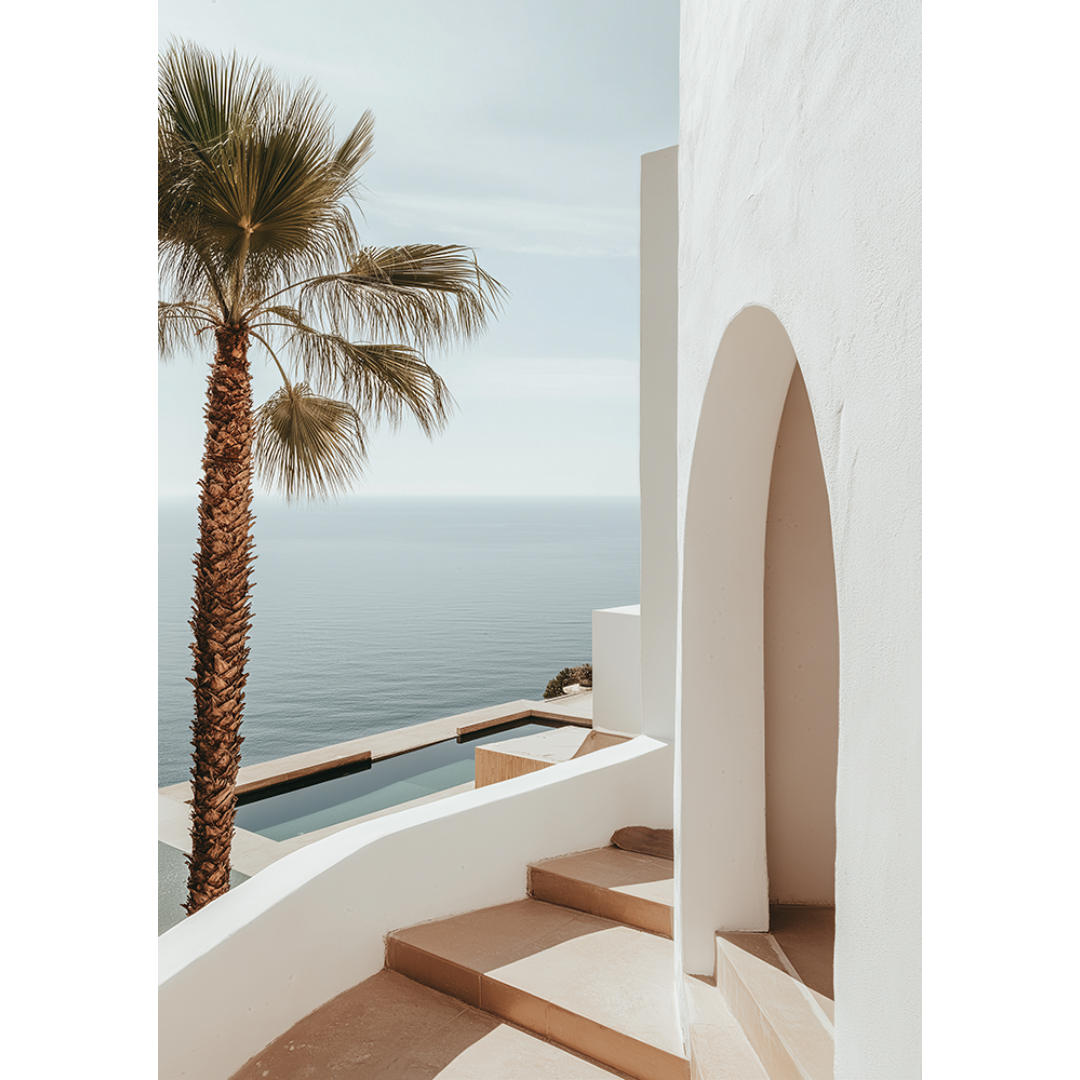 A captivating glimpse into Mediterranean luxury, Villa Blanca features crisp white architecture, graceful arches, and sun-drenched steps descending towards an inviting infinity pool and the expansive, cerulean sea. Warm terracotta hues, pristine whites, and tranquil blues come together in a sophisticated composition that brings a sense of serene escape and timeless elegance into any space. An aspirational piece that transports you to a private coastal paradise and invites dreams of sun-drenched days.