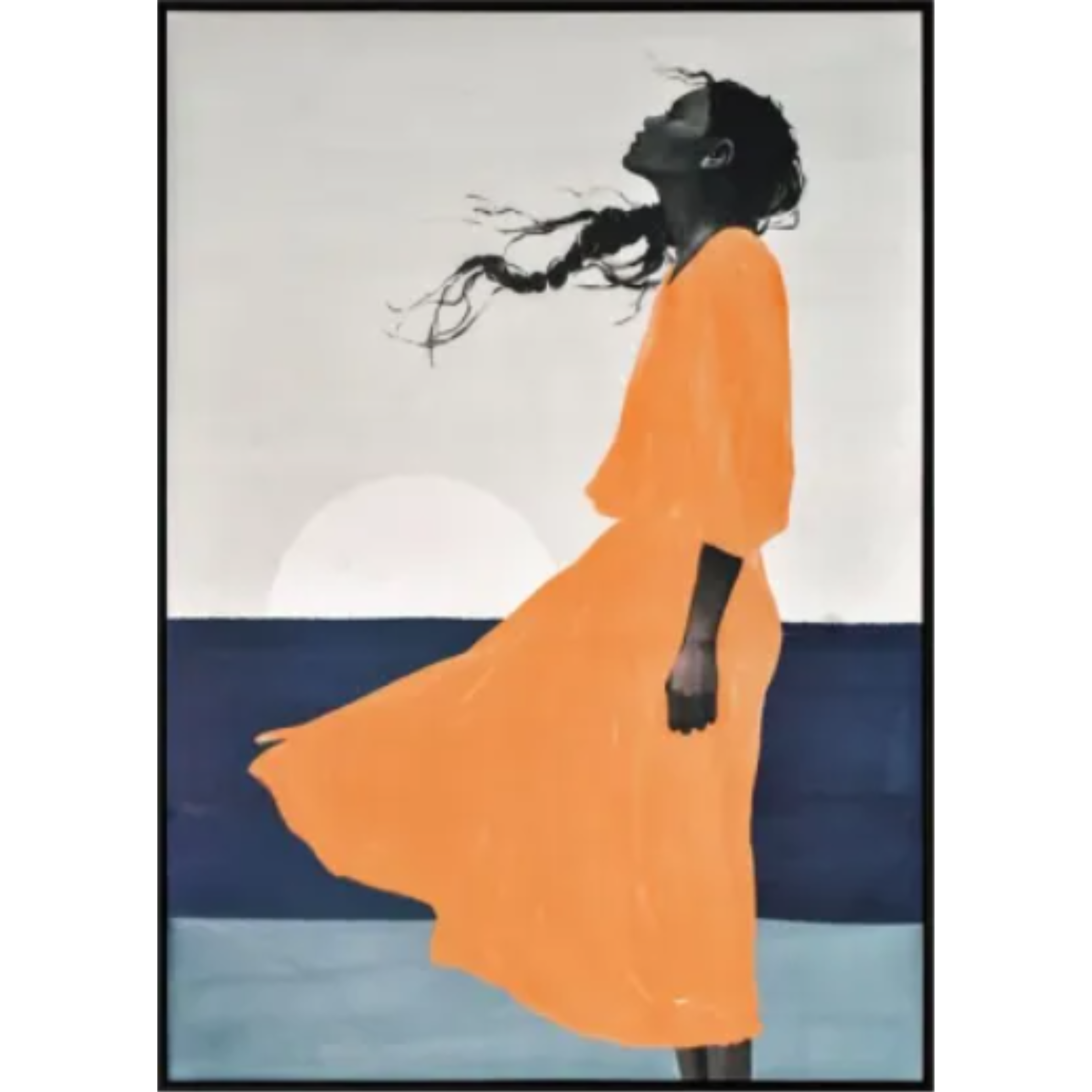 The Windy Sunsets Canvas Framed Wall Art captures the beauty of nature and the tranquility of a seaside breeze at dusk. Featuring a striking silhouette of a woman in a flowing orange dress, standing against the backdrop of the ocean and a setting sun, this piece evokes a sense of peace, freedom, and quiet reflection. The contrast between the deep blues of the sea and sky with the vibrant orange dress creates a visually stunning composition that brings warmth and movement to any space.